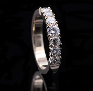 Ko pogledamo ta prstan, takoj opazimo popolno linijo briljantov, ki so natančno vkovani v belo zlato. Vsak kamen je postavljen s kirurško natančnostjo, rezultat vrhunskih zlatarskih tehnik, ki jih mojstri prenašajo na nove generacije. Bleščeči sijaj briljantov ustvarja občutek prestiža, kovina pa daje hladno, elegantno osnovo, ki poudari čistost vsakega od lesketajočih se kamnov. To ni le nakit. To je doživetje.